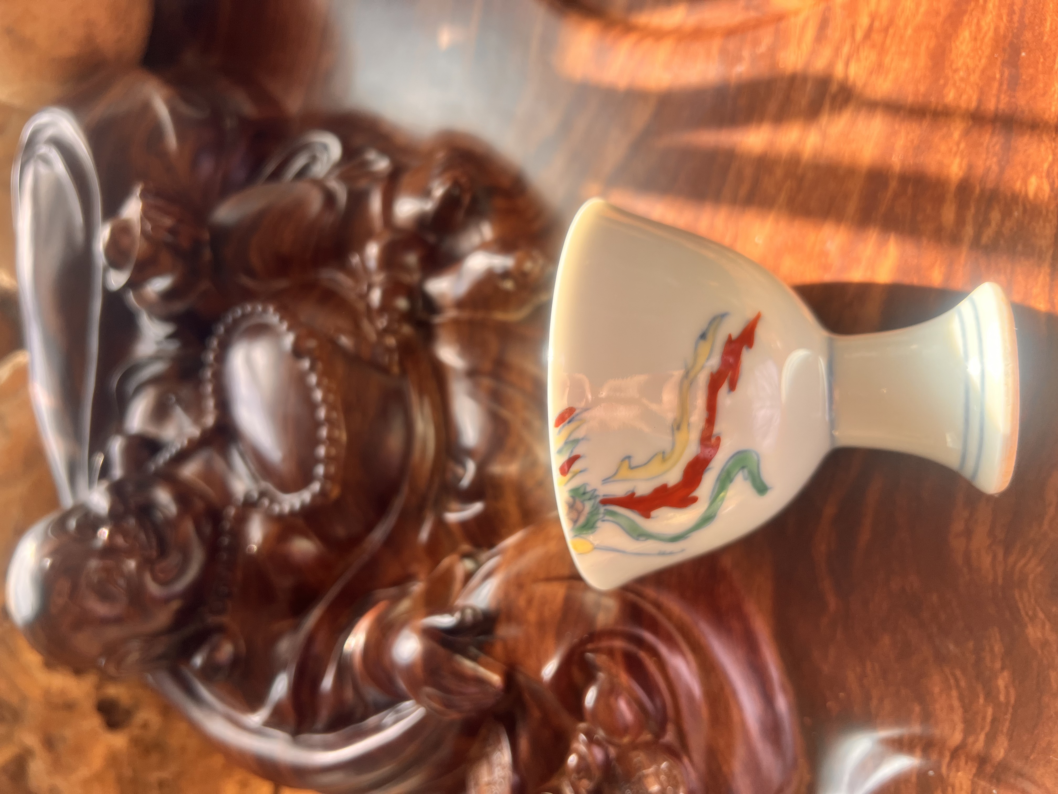 色料经过特殊调配,黄彩呈现出细腻的色阶变化,红彩油润光泽,绿彩清透澄澈。彩料历经氧化形成鱼子纹开片,在光线照射下显现金银光斑,美不胜收。整体色调鲜丽而不失雅致,堪称成化斗彩瓷器中的精品,代表了当时制瓷工艺的最高水平。大明成化斗彩纹高足杯,以其独特的魅力穿越时空,向我们诉说着明代瓷器的辉煌与传奇,成为中华民族文化宝库中一颗璀璨的明珠。