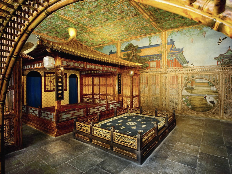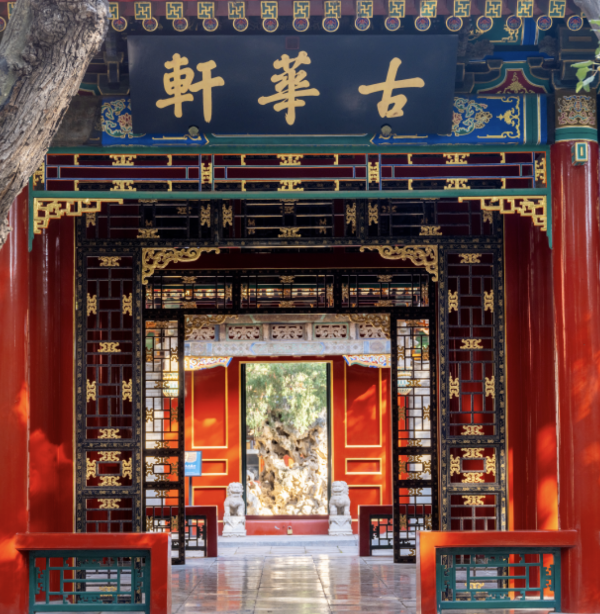 古华轩是一座三开间带周围廊的典型宫廷建筑敞轩。它有着琉璃瓦、绿剪边的外观,这是北方宫廷建筑的特色。走进室内,你会发现整个四面全部都是黑漆描金的落地罩。这种黑漆的加工工艺,实际上是南方的一种工艺特征。在北方,这种工艺既不利于加工,也不利于保养。不过,这可是乾隆皇帝的一大创新,他把黑漆描金的落地罩移植到了这个半开敞的空间里,别有一番风味。