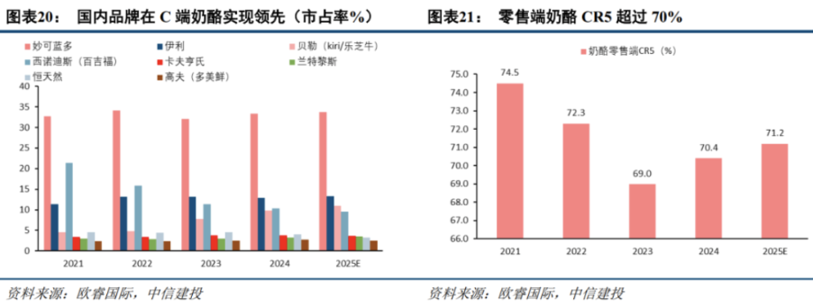 奶酪方面,国内消费以再制奶酪为主,而国产原制奶酪产量仅占14%。C端消费正从单一儿童奶酪棒向成人奶酪、家庭餐桌场景延伸,国产品牌影响力不断提升;B端则通过推出干酪产品维持高增速扩张。