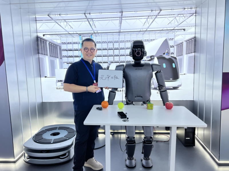 開場的兩個萌型機器人,為此次參觀活動奠定了輕鬆活躍的氛圍,華文媒體社長總編輯們積極與機器人互動,感受到了人形機器人非凡的魅力。在智慧物流核心產品展區,有一個機器人可以精準識別物品並抓取至指定位置,還能通過多個攝像頭看到周圍發生的事情,精準描述當時嘉賓們進行參觀與聆聽的場景。馬來西亞《光華日報》署理總經理林星發在白板上寫下「光華日報」四個字給機器人看,它立刻讀了出來,讓在場嘉賓忍俊不禁。