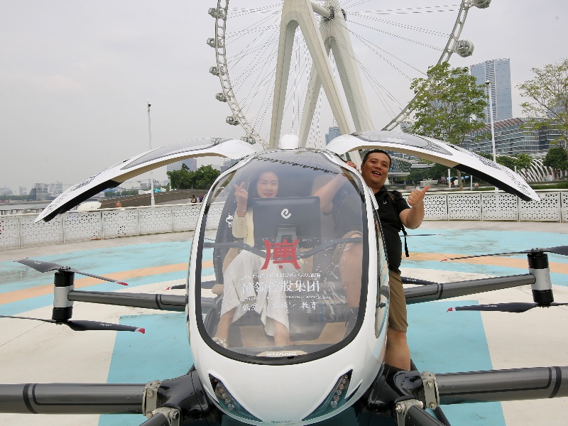 在展示区,亿航智能旗下的EH216-S无人驾驶载人航空器成为焦点。该款无人驾驶载人航空器已获得由中国民用航空局颁发的标准适航证,成为首个获得适航证的无人驾驶载人电动垂直起降(eVTOL)航空器,侧面更贴著“鹏城之翼”字样,可搭载2名乘客,整体造型外观酷炫,科技感十足。据介绍,今年4月全球顶流网红“甲亢哥”深圳行直播时也曾乘坐此款飞行器。参观期间,社长、总编辑们对“鹏城之翼”无人机浓厚兴趣,纷纷举起手机对着“鹏城之翼”拍个不停,排着队坐进机舱座椅,与之合影留念。
