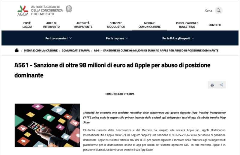意大利竞争与市场管理局调查发现,自2021年4月起,苹果针对iOS设备第三方应用开发者推行的ATT政策存在明显限制竞争行为。根据该政策,开发者若想通过苹果弹窗收集用户数据用于广告推广,必须获得用户专项授权。然而,弹窗设计不符合隐私法规要求,导致开发者需就同一目的重复申请授权。