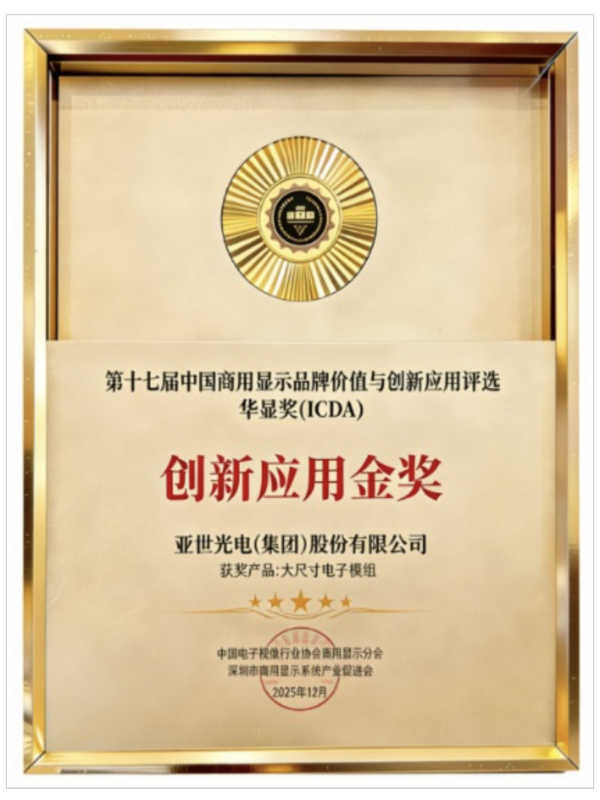 近日,第十七届中国商用显示品牌价值与创新应用评选(ICDA)华显奖颁奖盛典在深圳圆满落幕。亚世光电(002952)凭借自主研发的大尺寸电子纸模组,从众多参评企业中脱颖而出,荣获“创新应用金奖”。这一奖项标志着行业对其在商用显示领域技术突破与场景落地能力的高度肯定。