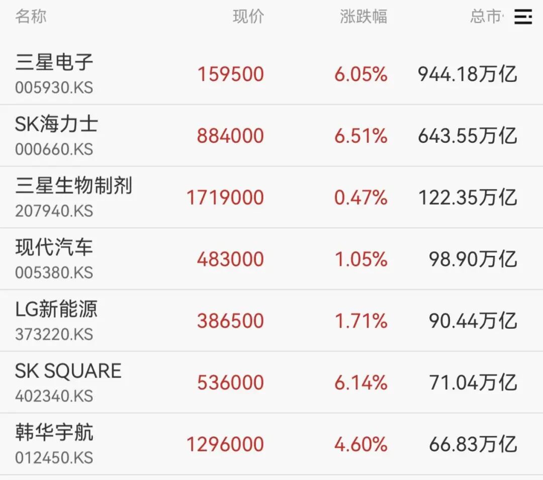 2月3日,韩国股市同样迎来大爆发。韩国综合指数盘中一度大涨超6%,截至券商中国发稿,上涨5.87%。其中,三星电子涨幅一度超过10%,创2020年3月以来最大涨幅,最终涨超9%;SK海力士涨超8%;韩美半导体涨超6%。韩国股市周二的反弹主要由本地机构投资者推动,外资也净买入股票。韩国副财长李亨一表示,韩国政府有“足够的政策能力”应对任何外部不确定性,同时鉴于汇市波动性似乎正在加剧,政府将密切留意金融市场动向。