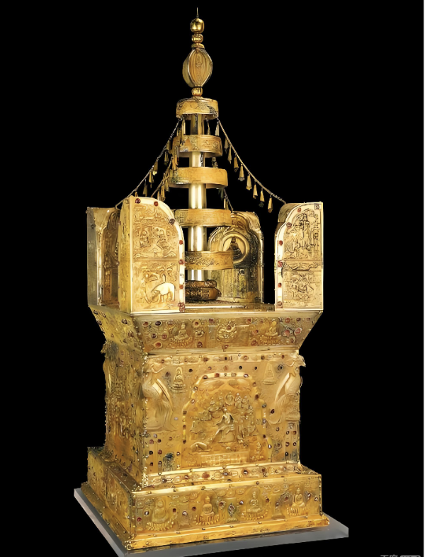 塔体表面的工艺更是令人惊叹。工匠们精心捶揲出精美的纹饰与图案,还凿有 452 个圆孔,原本镶嵌着水晶、玻璃、玛瑙、青金石等宝石,虽有不少已脱落,但仍难掩其华丽精致。塔座内部中空,塔盖顶部中心竖立着塔刹。从下向上,设有五层相轮,逐层内收,顶部是火焰珠和葫芦形宝瓶。塔盖顶部四角设有四座山花蕉叶,与塔刹之间用链条连接,链条下还悬挂着一串串精巧的风铃。微风拂过,仿佛能听到千年前的清脆回响,让人不禁遐想当年这座宝塔的辉煌。