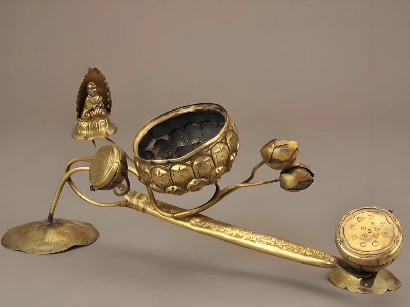 其中一件香炉,整体造型宛如一支横放的莲花,银质鎏金质地。荷叶向下生长成为托座,一朵莲花亭亭玉立,化为炉身,錾刻而成的莲瓣生动逼真。炉下支出一条茎干,上面有一尊佛像,含苞待放的花蕾蜿蜒生长,整个香炉显得生机勃勃。此类香炉存世数量极少,因而异常珍贵。