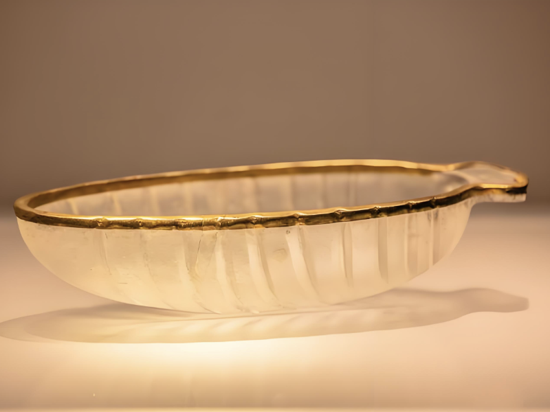 还有一只水晶杯,用整块剔透水晶碾磨而成,具有玻璃般的透明度,通体光素。整个器形宛如一枚蕉叶,叶脉疏朗,口沿一侧为扁扇形柄,器口镶银鎏金包边,生动呈现了宋代注重形神勾勒的玉雕风格,尽显古朴典雅之美。