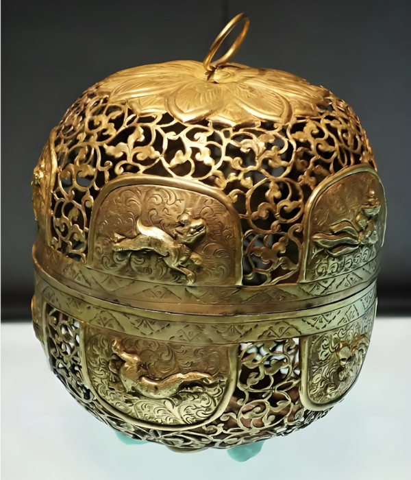 另外,一个银质香囊也十分引人注目。它通体鎏金,上、下两部分造型相同,以子母口盖合。以上半部为例,顶部中心为双层覆莲瓣,莲瓣中心设圆形拉环,器身以卷草为底纹,以三只鸾鸟和两只瑞兽为主纹饰,既美观又实用,堪称艺术与功能的完美结合。