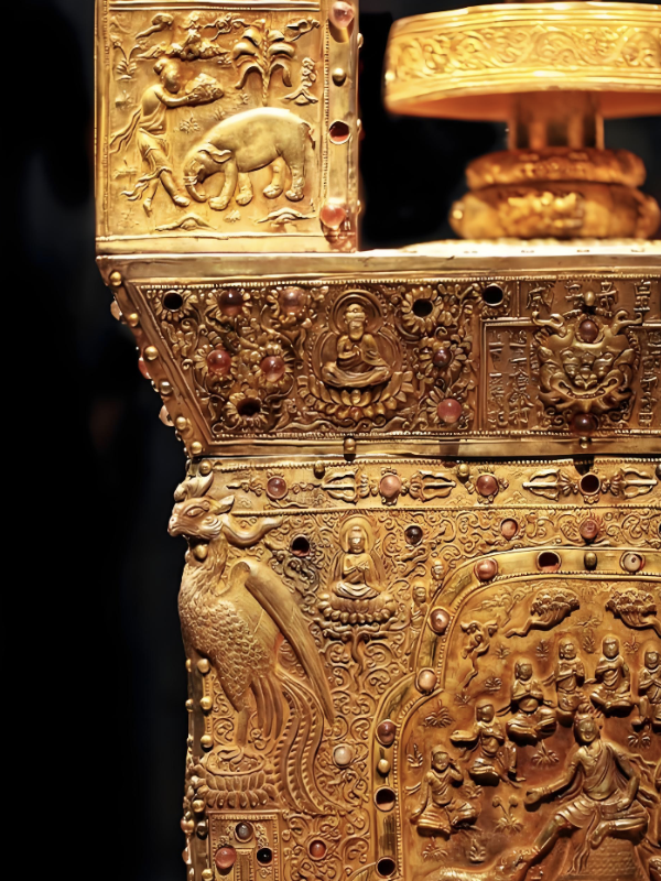 2008 年,在南京大报恩寺遗址,一座七宝阿育王塔惊艳出土。在我国已出土的阿育王塔中,它堪称“塔王”,体量最大、工艺最为复杂、制作也最为精美。这座塔由塔盖和塔座上下两部分组成,以子母口形式巧妙合在一起。内部是檀香木制作的骨架,表面包着银皮,还通体鎏金,远远望去,仿佛自带金光滤镜,散发着神秘而华贵的气息。