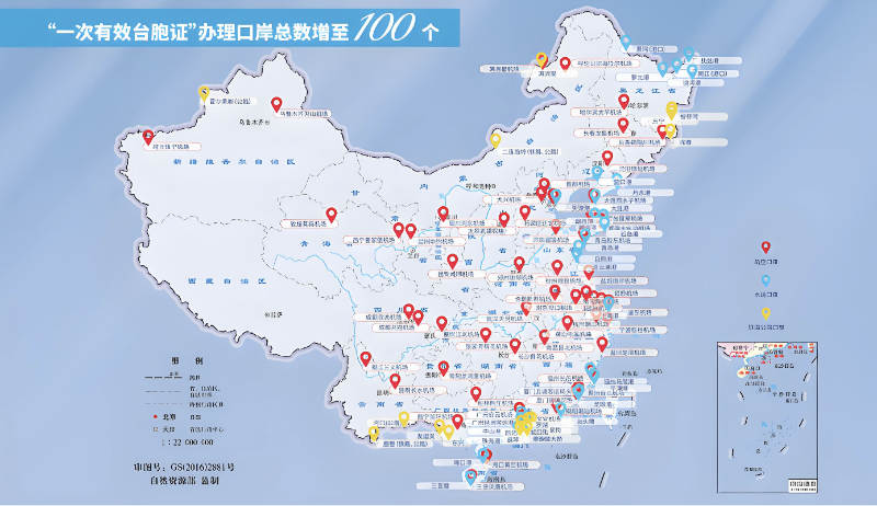 为进一步便利台湾同胞往来大陆,促进两岸人员交流与融合发展,自今日([具体日期])起,大陆可签发一次有效台胞证的口岸数量大幅增加,一举跃升至 100 个,目前各项相关准备工作均已全面就绪,静候台湾同胞的到来。