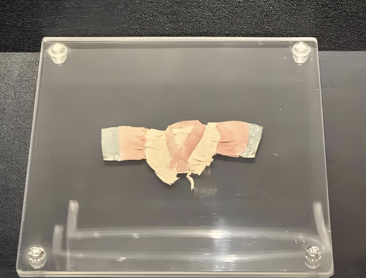 这件珍贵的丝绸玩具衣,不仅传递着边塞家庭深沉的爱子之心,更成为研究汉代社会风貌的珍贵线索。它完整地保留了交领右衽的结构,这是汉代服饰最重要的文化特征之一,彰显着汉文化的独特魅力。其尺寸比例也基本符合儿童身体特征,从中可以折射出当时儿童穿衣风格在基本形制上与成人相似,反映了汉代服饰文化的传承与发展。
