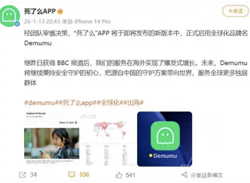 面对海外市场的文化差异,团队于近期完成品牌重塑,将原名“死了么”升级为国际化名称“Demumu”。郭先生解释称,新名称前半部分“De”取自英文“Death”,承接原名的话题热度;后半部分“mumu”则通过叠词设计传递亲切感,形成“死亡+Q萌”的反差记忆点。“我们希望用更轻松的方式化解沉重话题,让安全守护更具温度。”