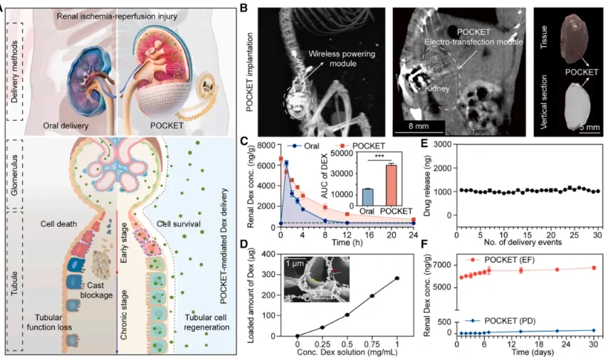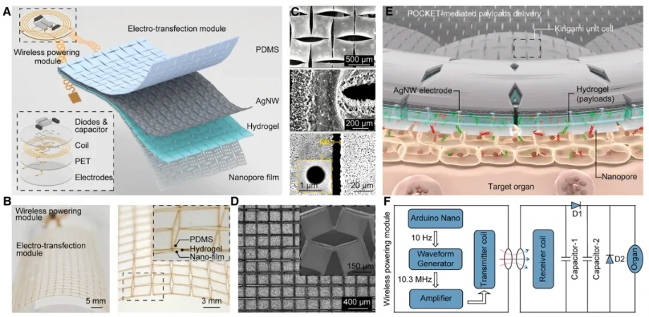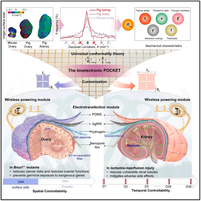 这款名为POCKET的器件如同一个智能“口袋”,采用四层功能化设计,包括与组织直接接触的纳米孔阵列薄膜、负载药物的水凝胶储药层、负责电场分布的银纳米线电极层以及柔性基底层。通过飞秒激光精密加工,它能像创可贴一样,高度共形、大面积地贴合在不同物种的多种器官表面,如卵巢、眼球、肾脏等。