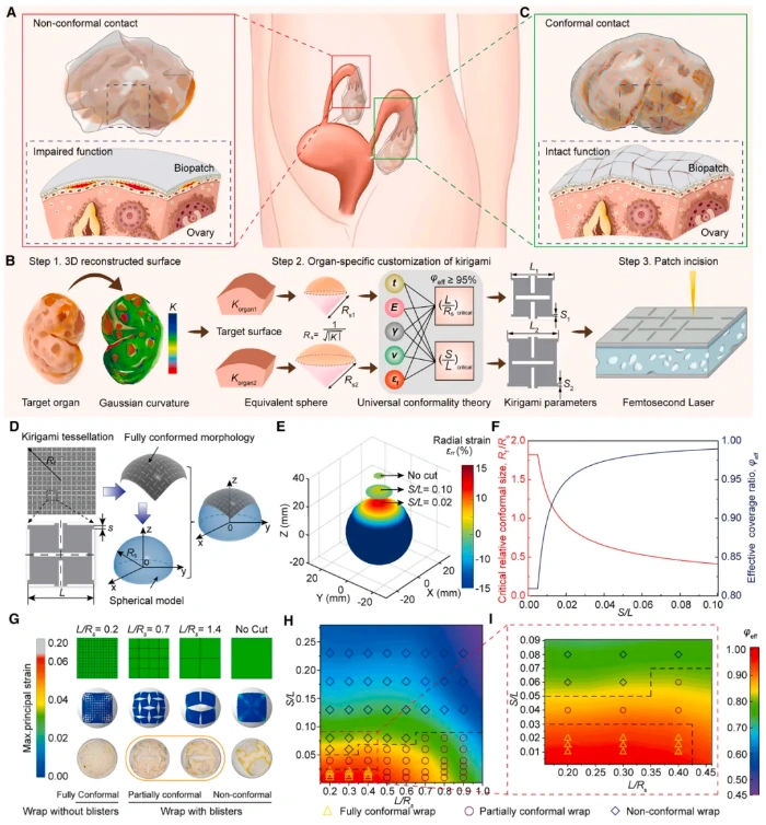 针对这一痛点,研究团队另辟蹊径,将目光投向了物理方法——电穿孔,并从中国传统剪纸艺术中汲取灵感,创造性地提出了“器官定制化剪纸共形理论”。该理论首次建立了剪纸结构几何参数与器官曲率、材料属性之间的定量关系。简单来说,通过为特定器官进行“三维扫描”,就能“智能生成”最合身的器件尺寸,从而设计出既能完全共形贴合、又能最大限度保留功能面积的“电子外衣”,有效覆盖率超过95%。