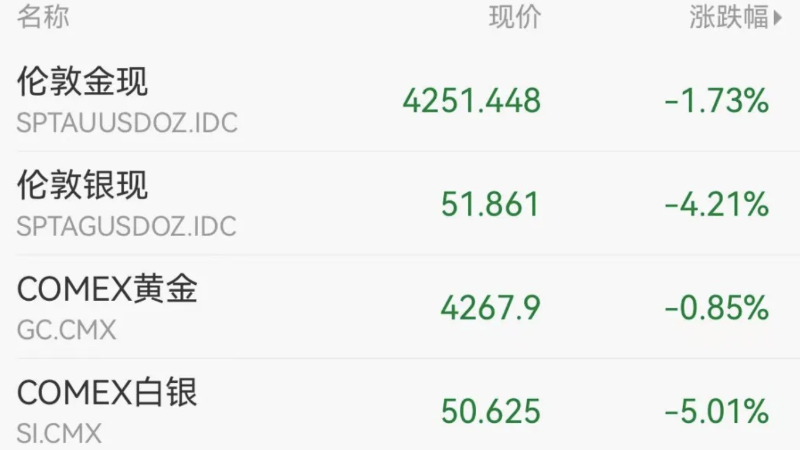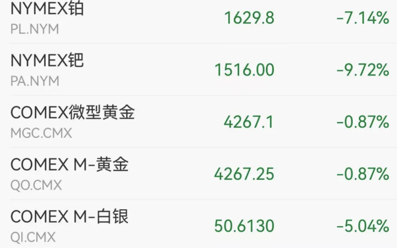 在期货市场方面,富时A50期指夜盘收涨0.97%,报15004点。国际贵金属期货价格也持续下跌,其中现货白银一度跌幅超过6%,创下六个月来的最大跌幅;现货黄金在盘中创下历史新高后突然跳水,一度跌破4200美元/盎司。具体来看,COMEX黄金期货价格下跌0.85%,报4267.9美元/盎司;COMEX白银期货价格下跌超过5%,报50.625美元/盎司;NYMEX钯金期货价格大跌超过9%,报1516美元/盎司;NYMEX铂金期货价格也大幅下跌超过7%,回吐了过去两个交易日的全部涨幅。