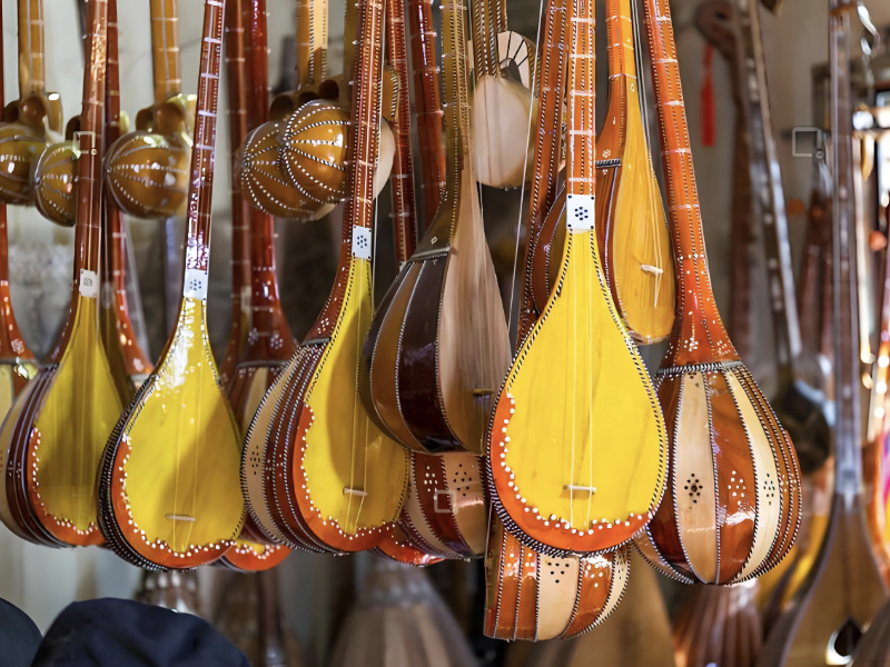 村子里终日萦绕着刨木声与音调调试声,工匠们沿用数百年的工具与工序,制作出都塔尔、热瓦普、艾捷克等20余种精美的维吾尔族乐器。小型化、装饰化的乐器模型成为热门的文创产品,乐器制作体验游吸引着八方来客。