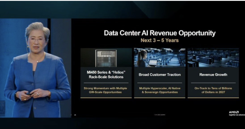 苏姿丰还透露,AMD预计未来三到五年,公司年均营收复合年增长率将超过35%,其中AI数据中心的营收平均增长率将达到80%。对比目前分析师的预测均值,今年AMD的年销售预计增长32%,2026年和2027年将分别增长31%和39%。在苏姿丰讲话期间,AMD股价在美股午盘刷新日低时一度跌逾3.8%,随后拉升转涨,盘中涨幅约2%,但涨势未能持续,之后又重回跌势。不过,美股盘后,AMD股价上涨超3%。