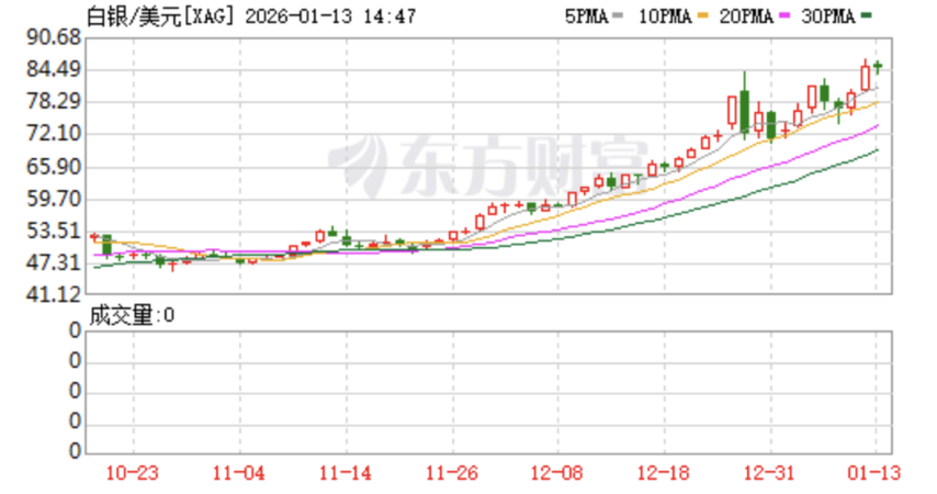 截至当日收盘,现货白银价格涨幅超6%,报每盎司85.15美元,日内更是飙升逾7%,最高触及85.74美元;现货黄金也不甘示弱,一度上涨2.4%,达到每盎司4620.34美元,二者均刷新了2025年12月下旬创下的历史纪录。与此同时,美元指数报98.88,日内一度下跌近0.5%。美股市场则呈现低开高走态势,三大指数开盘集体走低,不过银矿股却逆势上扬,Hecla矿业上涨8.95%,Coeur矿业上涨5.93%。