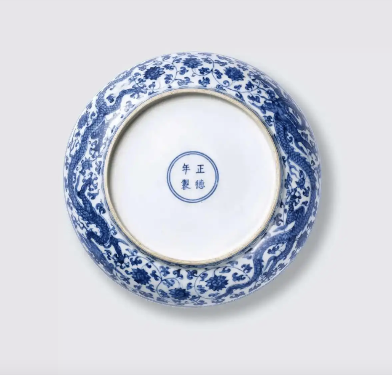 通体纹饰布局严谨,繁而不乱,青花呈色淡雅,浓淡相宜,极具时代特色。底部青花书“正德年制”四字双行楷书款,字迹工整,结构清秀而笔力内蕴,其中“德”字心上无横,乃正德时期官窑款识的典型书写特征。正德时期瓷器上承成化、弘治旧制,下启嘉靖新貌,此盘整体纹饰描绘细腻,青花发色略呈灰蓝,正是典型的国产青料石子青所致,与绘画笔触相得益彰,营造出良好的艺术效果。
