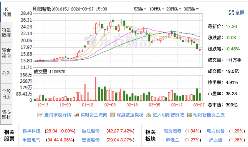 二级市场方面,截至3月27日收盘,明阳智能股价报17.26元/股,当日下跌0.46%,公司总市值约390亿元。此次投资项目后续进展如何,市场正密切关注。