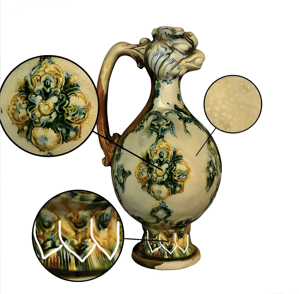 这件器物的“混血”气质尤为独特:其流线型壶身与把柄设计借鉴自波斯萨珊王朝金银器,而凤鸟纹饰与三彩釉工艺则是唐文化的典型符号。东西方审美在此碰撞——西域的华丽曲线邂逅中原的祥瑞图腾,金银器的奢华质感融入陶土的质朴温润,最终熔铸成一件兼具实用价值与艺术高度的“跨界爆款”。