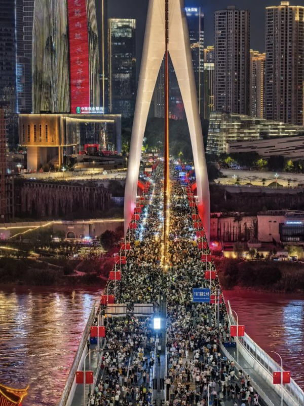 科技与文旅的深度融合,也为假日夜间消费增添了更多亮点。10月1日晚,以“家国共庆”为主题的大型无人机灯光秀在重庆长江与嘉陵江上空上演。数千架无人机在夜空中组成璀璨光影,为游客带来一场兼具科技感与人文温度的视觉盛宴。