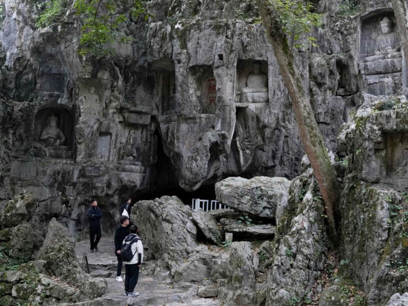 长久以来,许多游客习惯径直入寺祈福,而忽略江南地区最大的石窟造像群。如今景区免费开放,这座承载厚重历史的石刻宝库吸引更多游客目光。飞来峰的115龛390余尊石刻造像分布于山崖间、溶洞中,雕琢艺术精美细腻,与江南本土文化、艺术审美、山水园林融合,形成独有韵味。造像不仅雕刻信仰,也镌刻文心。白居易在此写下《冷泉亭记》、苏轼吟诵“溪山处处皆可庐,最爱灵隐飞来孤”、王安石借景抒怀“不畏浮云遮望眼”……自唐至民国的摩崖石刻如跨越时空的“留言”,汇聚成飞来峰深厚的文脉传承,使其成为弥足珍贵的江南文化宝库。