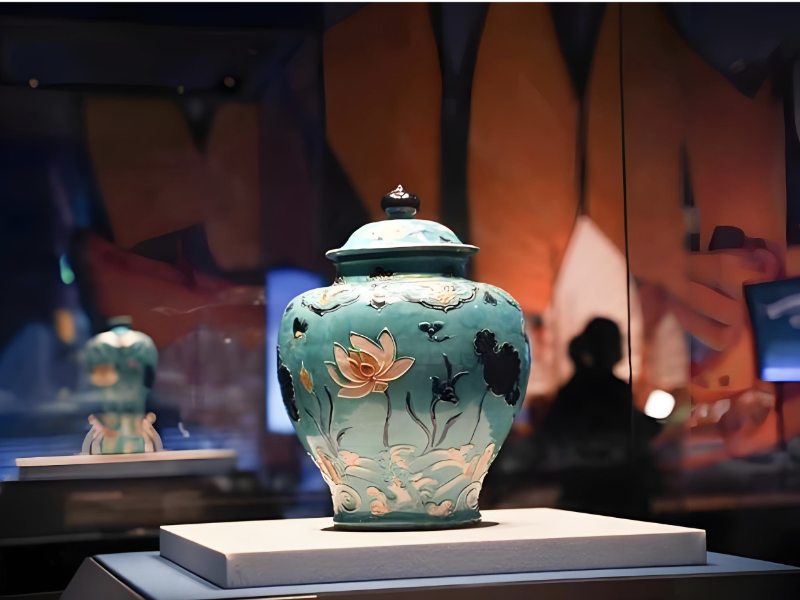 展览中,观众可以近距离欣赏到青花鱼跃龙门应龙纹大盘、青花孔雀牡丹纹大盘、青花八仙人物故事图罐、青花应龙纹玉壶春瓶、素三彩象形执壶等重点文物。青花孔雀牡丹纹大盘内腹部绘有八朵山茶花,内底双圈内绘着孔雀牡丹纹,两只孔雀在牡丹花丛中嬉戏,两组纹饰以绹索纹间隔,精美绝伦。素三彩象形执壶的外形独具特色,器身整体为象形,象鼻卷曲上扬为流,象尾卷曲为柄,背披鞍垫,其上托宝瓶形壶口,缰绳于背部系结,结为花形,缰绳上挂多处装饰,象颈挂圆形铃铛,四足并拢直立,仿佛一头栩栩如生的大象跃然眼前。