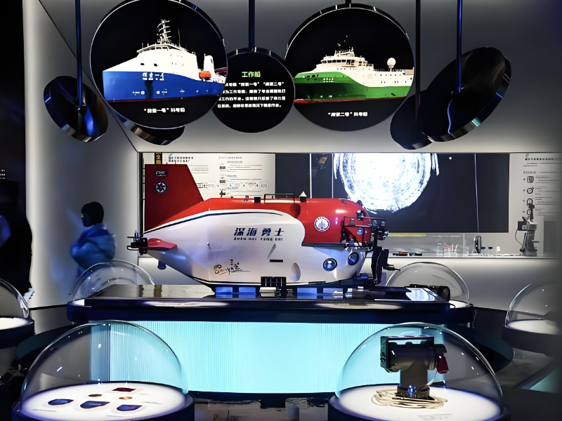 踏入展厅,观众瞬间被蔚蓝的色调所包围,地面如水波般荡漾,循环播放的鲸鸣声在耳边回响,仿佛跟随深海考古队一同踏上了未知的征程。“普通观众对深海环境或许知之甚少,但又充满好奇。”首都博物馆展览部策展人黄小钰介绍道,“实际上,深海静谧无声,能见度极低,仅有10米左右,水温常年恒定在3℃左右,水压更是大得惊人。”