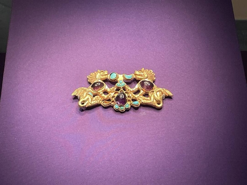 展览的第二部分,重点展示了吐蕃崛起后,高原社会步入文明发展新时期,高原各族人民共同创造灿烂高原文明的辉煌历程。外甥阿柴王之印、金胡瓶、双狮日月金牌饰等青海都兰县热水墓地2018血渭一号墓出土的多件文物在此集中展出。“该墓是热水墓群中发现的结构最完整、体系最清晰、墓室最复杂的高等级墓葬,据考证墓主为吐蕃时期的吐谷浑王,对研究吐蕃时期热水地区墓葬的归属、葬制葬俗及唐蕃关系等具有重要价值。”卢玥颖提到。