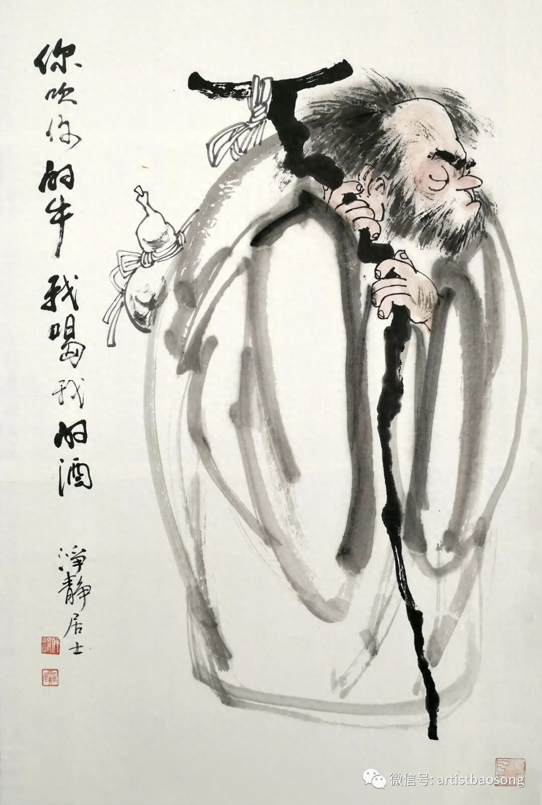 宝松大师画中的老头,歪头扭脖,满脸的不屑。身着长袍,手执拐杖,双眼闭着,嘴巴撅着,眉头皱着,脸上清清楚楚写着两个字:“谁信你那个鬼”!他的葫芦拴在拐杖上左右晃着,里面装的是酒还是智慧?您品。